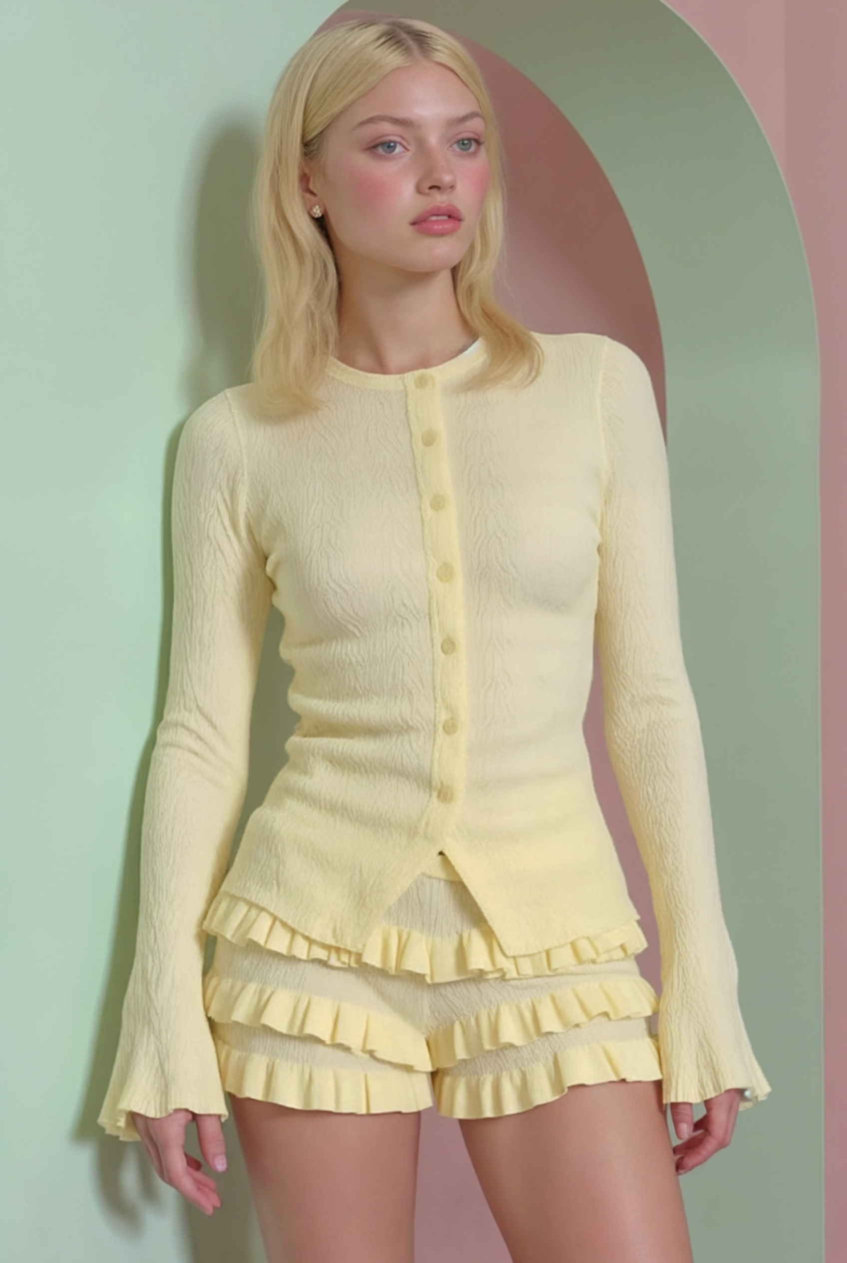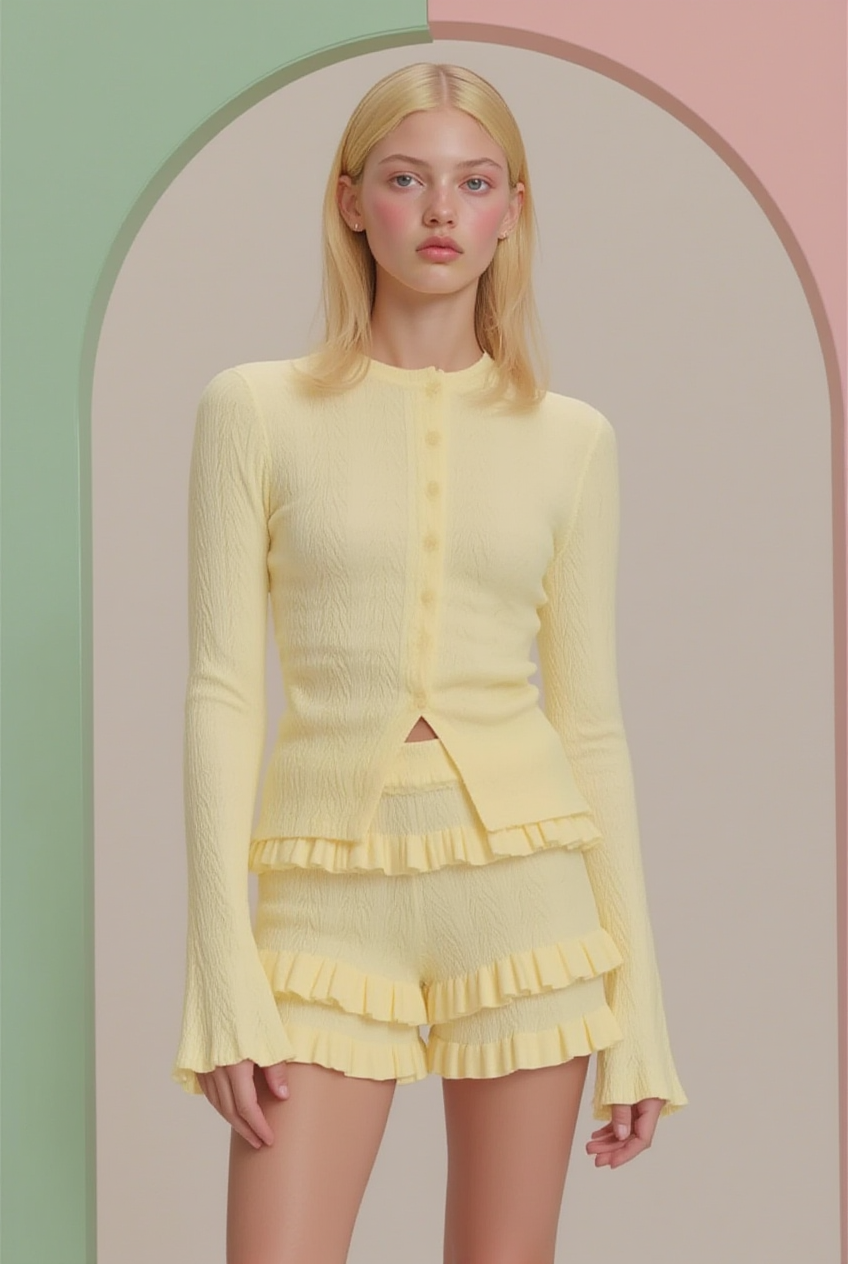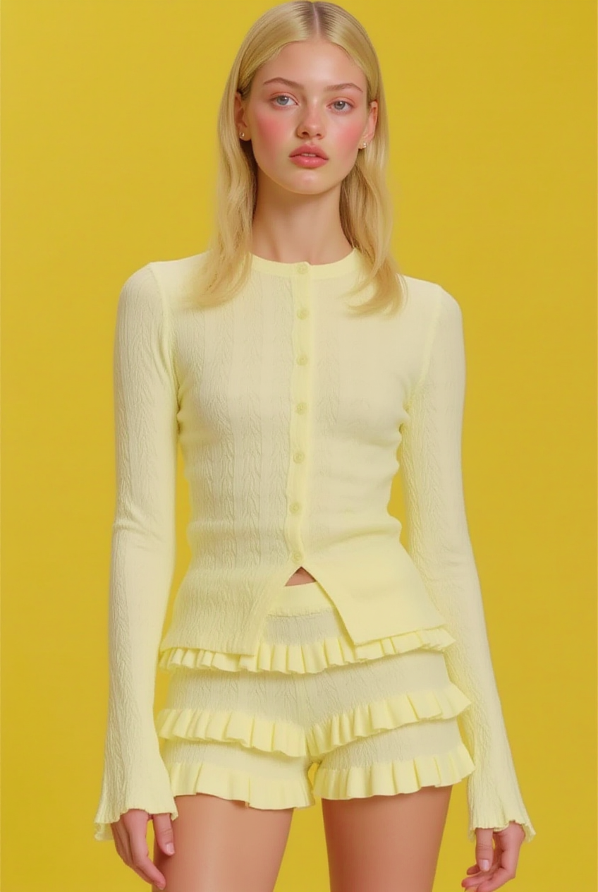 This knitwear set stands out for its cheerful and feminine design in a soft pastel yellow tone that radiates freshness and style. It features a fitted long-sleeve cardigan with matching fabric-covered front buttons, paired with high-waisted shorts adorned with delicate layered ruffles that add movement and charm.