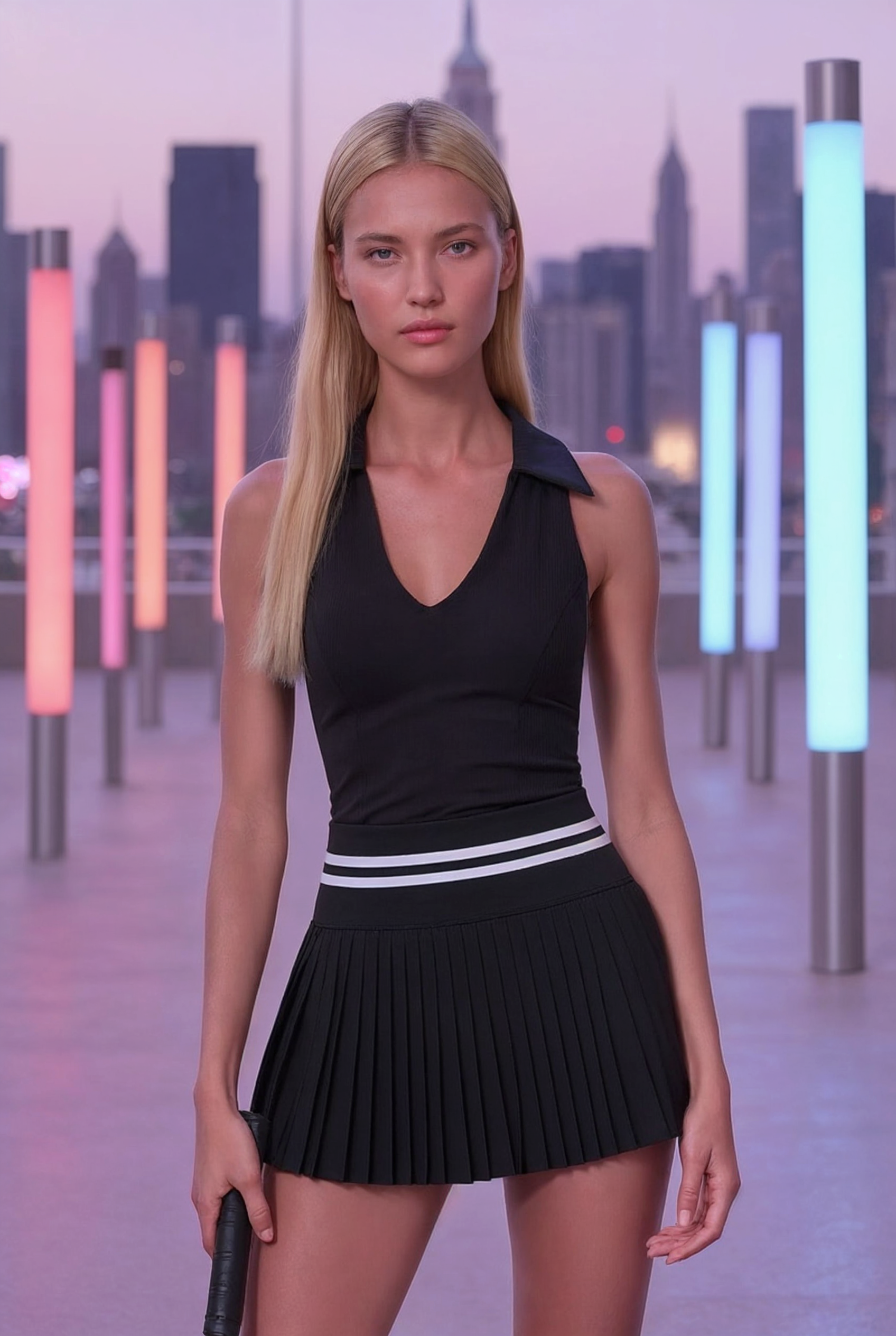 This sporty set consists of a sleeveless black top and a pleated mini skirt. The top features a stylish V-neckline and a classic collar, adding a touch of sophistication to the athletic design. The skirt is high-waisted with a thick waistband that features two white horizontal stripes, giving the outfit a dynamic and sporty feel. The pleats in the skirt provide movement and style, making this set both functional and fashionable. The combination of the top and skirt gives off a chic and modern athleisure vibe.