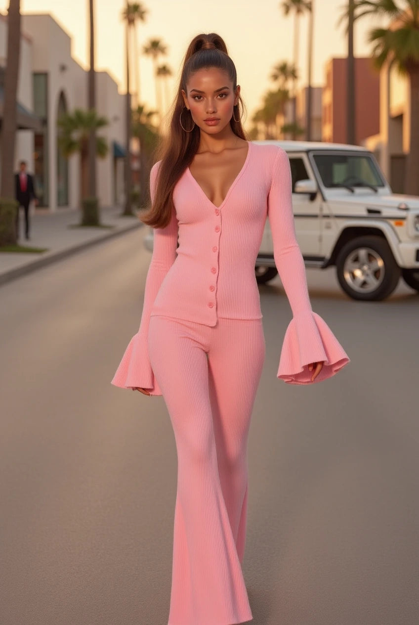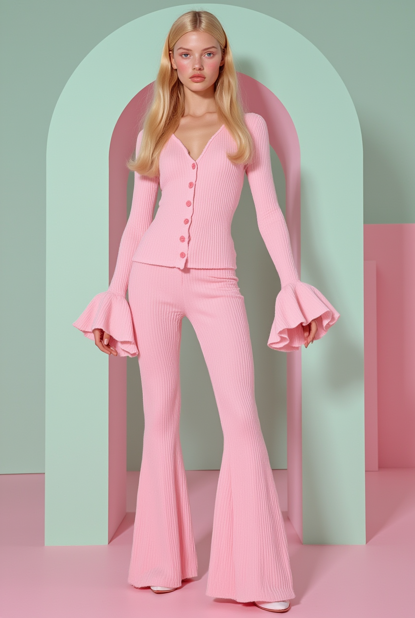This two-piece knit set features a bold and feminine design in a vibrant pastel pink shade. The long-sleeve top has a fitted cut with a V-neckline, front buttons, and flared ruffle cuffs that add a dramatic and sophisticated touch.
