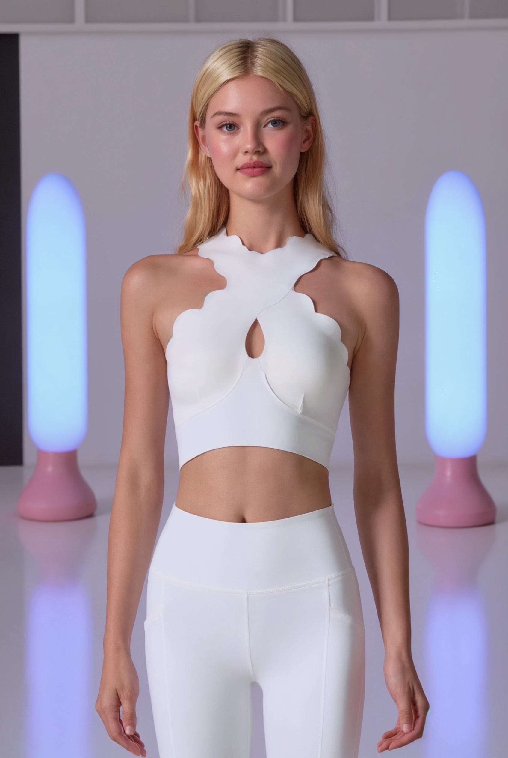 This sports set consists of a top and leggings in a clean white tone. The top has a contemporary design with soft wave-like cutouts at the neckline, creating a feminine and fluid silhouette. It is a fitted top, ideal for providing support during sports activities, with a design that accentuates the figure. The leggings feature a high waist, offering comfort and support, with a fitted cut that elongates the legs. The fabric appears to be stretchy, providing freedom of movement and comfort. This set is perfect for a modern, elegant athleisure look, suitable for both workouts and a relaxed daily style.